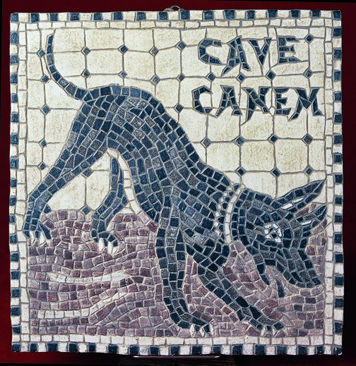 Ceterum ego, dum omnia stupeo, paene resupinatus crura mea fregi: Ad sinistram enim intrantibus, non longe ab ostiarii cella, canis ingens catena vinctus in pariete erat pictus, superque quadrata littera scriptum: CAVE CANEM.